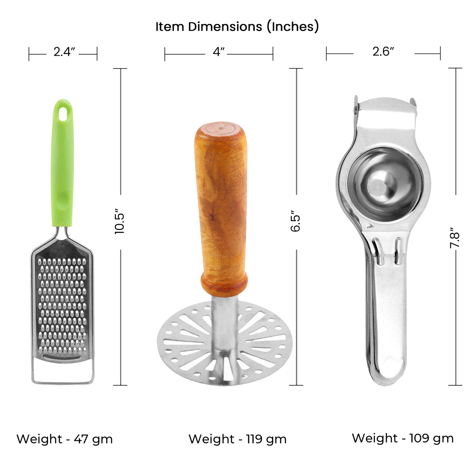 | Item weight | Grater 47 Gms Potato Masher 119 Gms Lemon Squeezer 110 Gms |